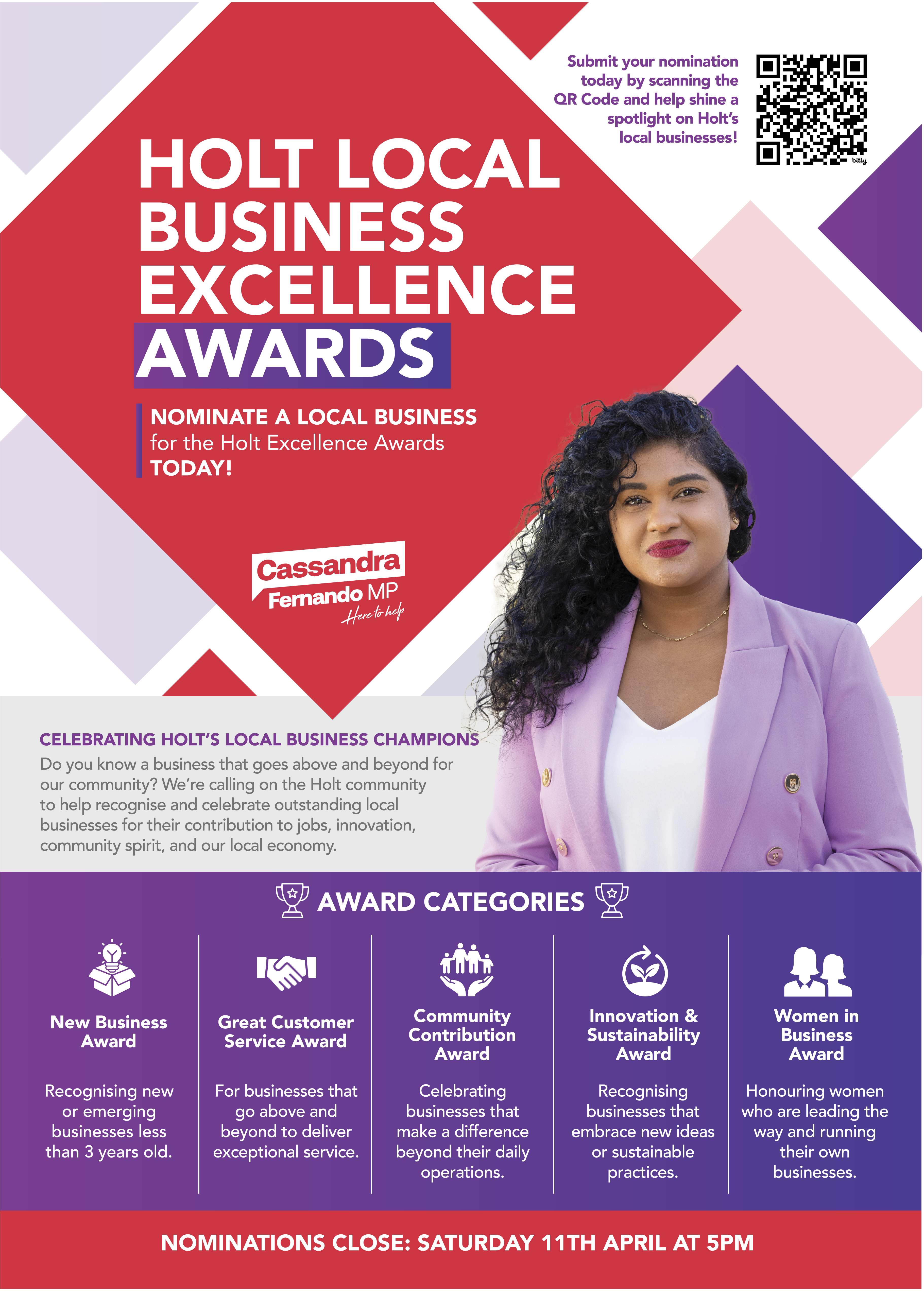 Getting involved is simple. Display an awards poster in your shopfront and encourage your customers to scan the QR code to submit a nomination before Saturday, 11 April.